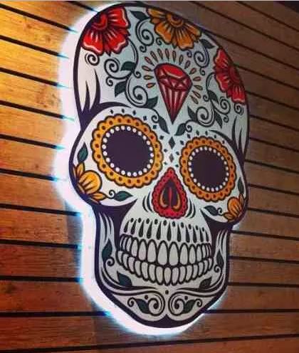 - um painel decorativo iluminado na forma de uma caveira acima de um painel para suporte e acabamento da saída elétrica.