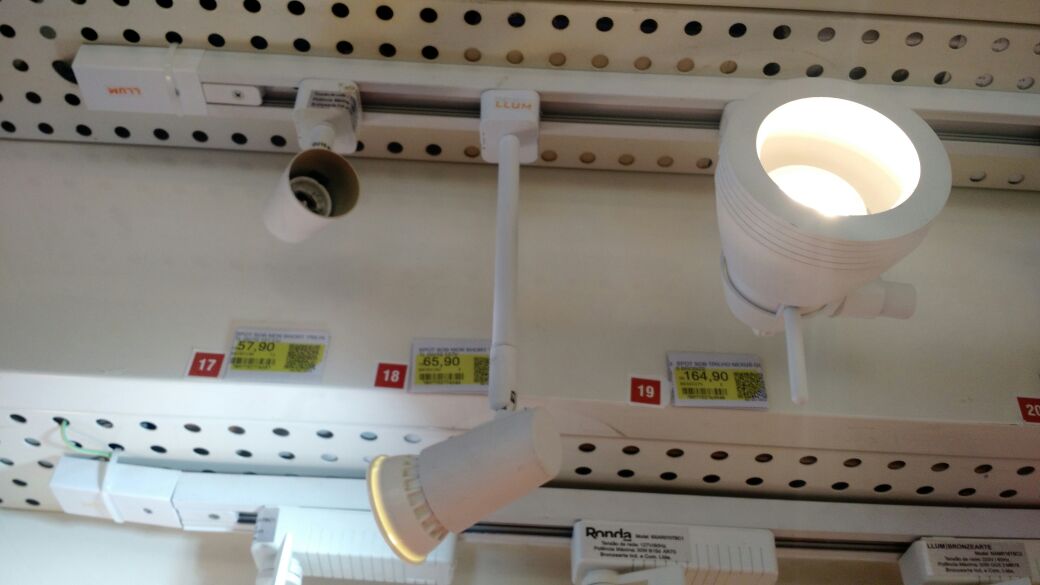- um spot articulado direcional fechado para leitura em tom quente na parede da TV de forma a iluminar a bancada; e