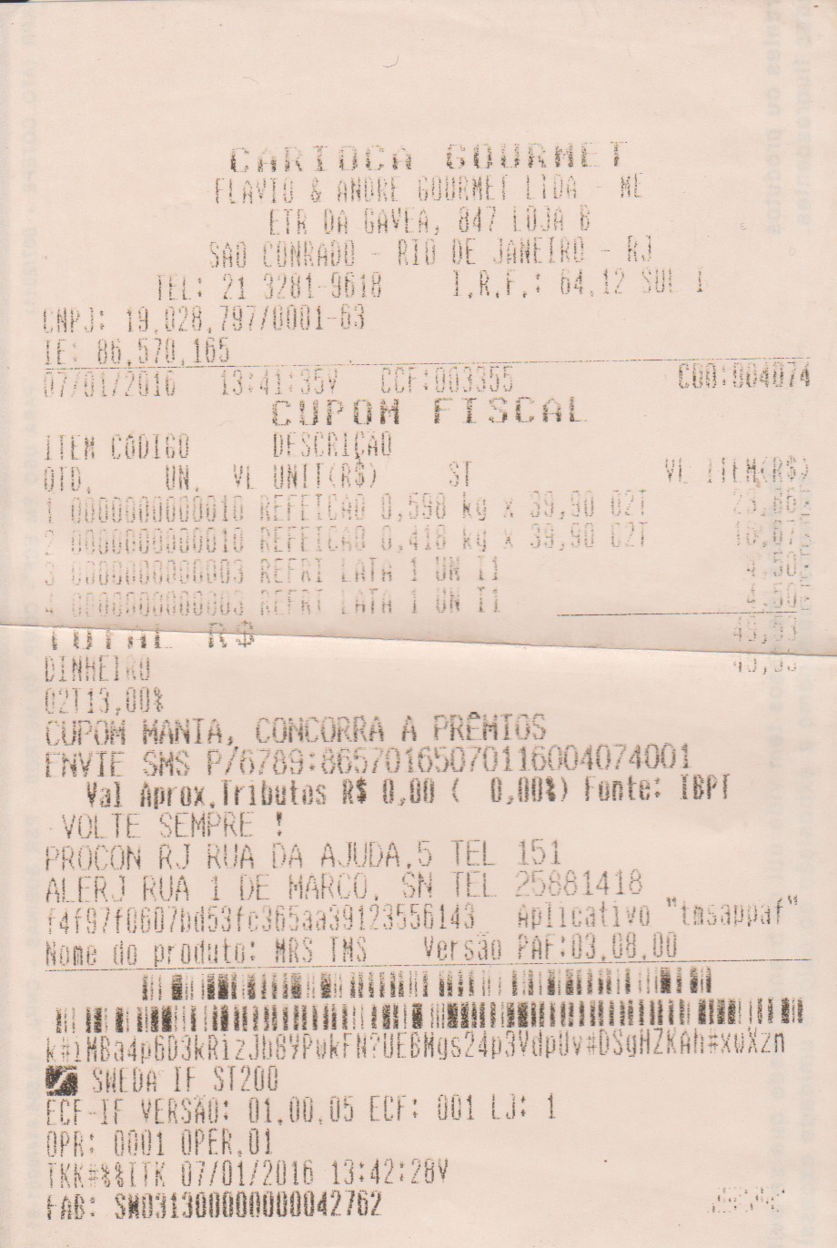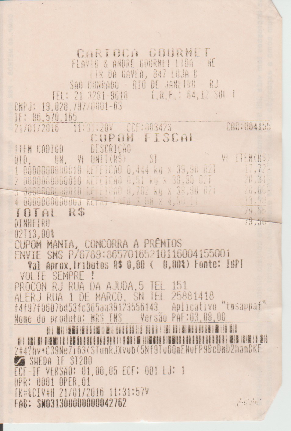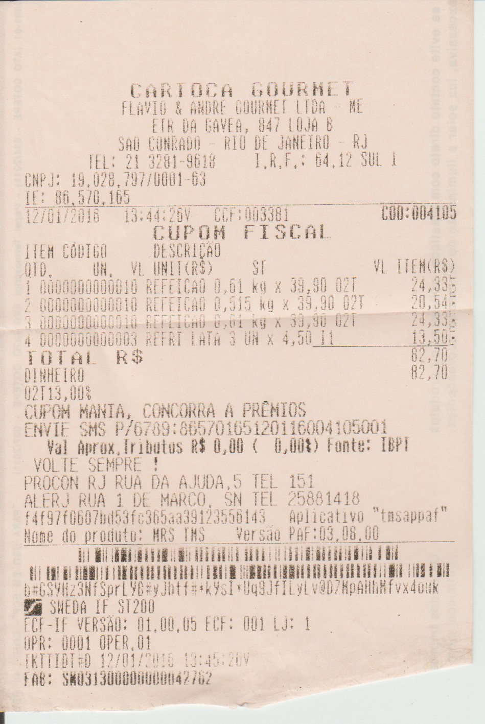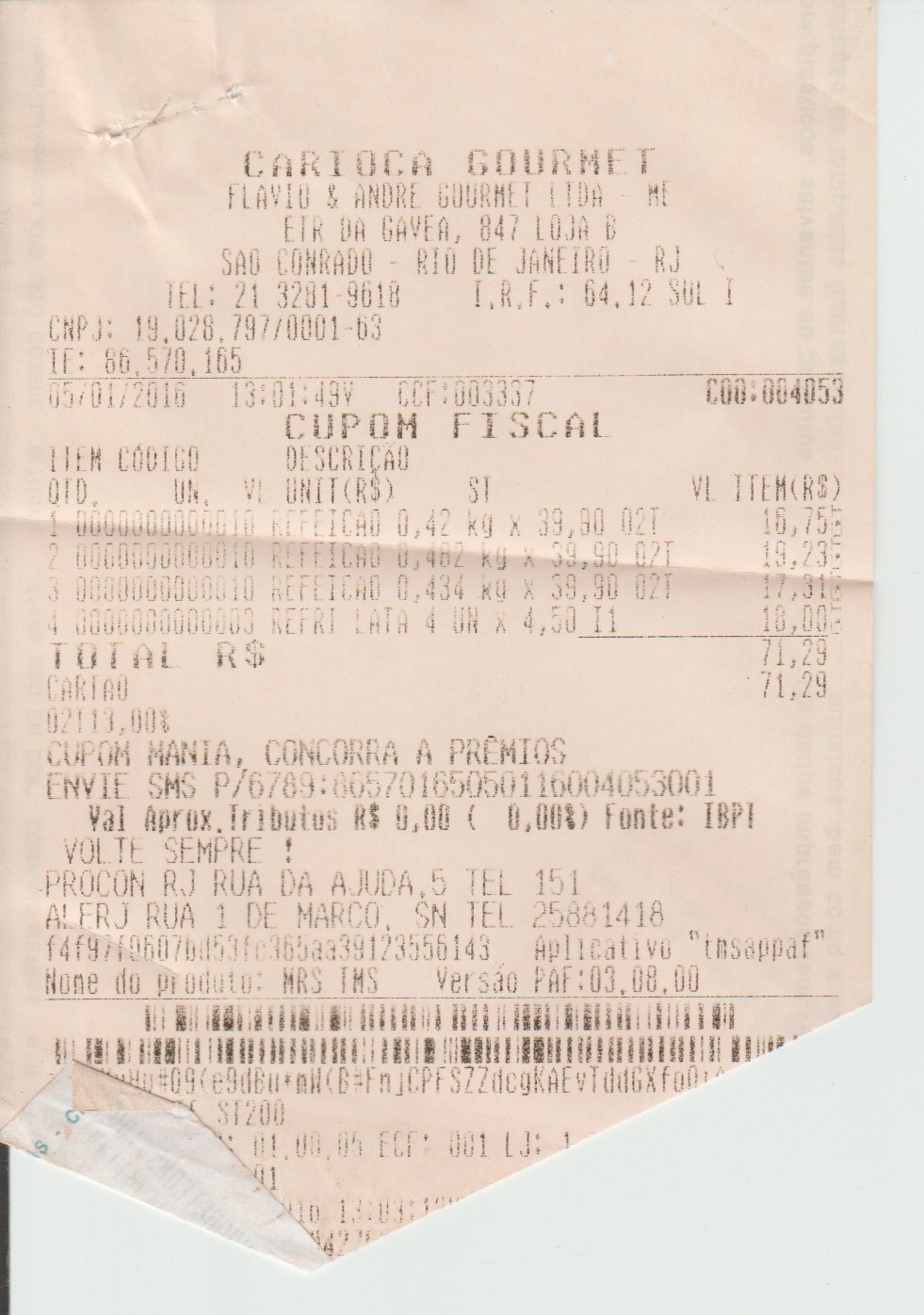 | 05/01/16 | Almoço em projeto | 1 | 71,29 | 71,29 | 0,00 | 71,29 | Almoço equipe | Carioca Gourmet (Proj Eduardo Figueiredo) |