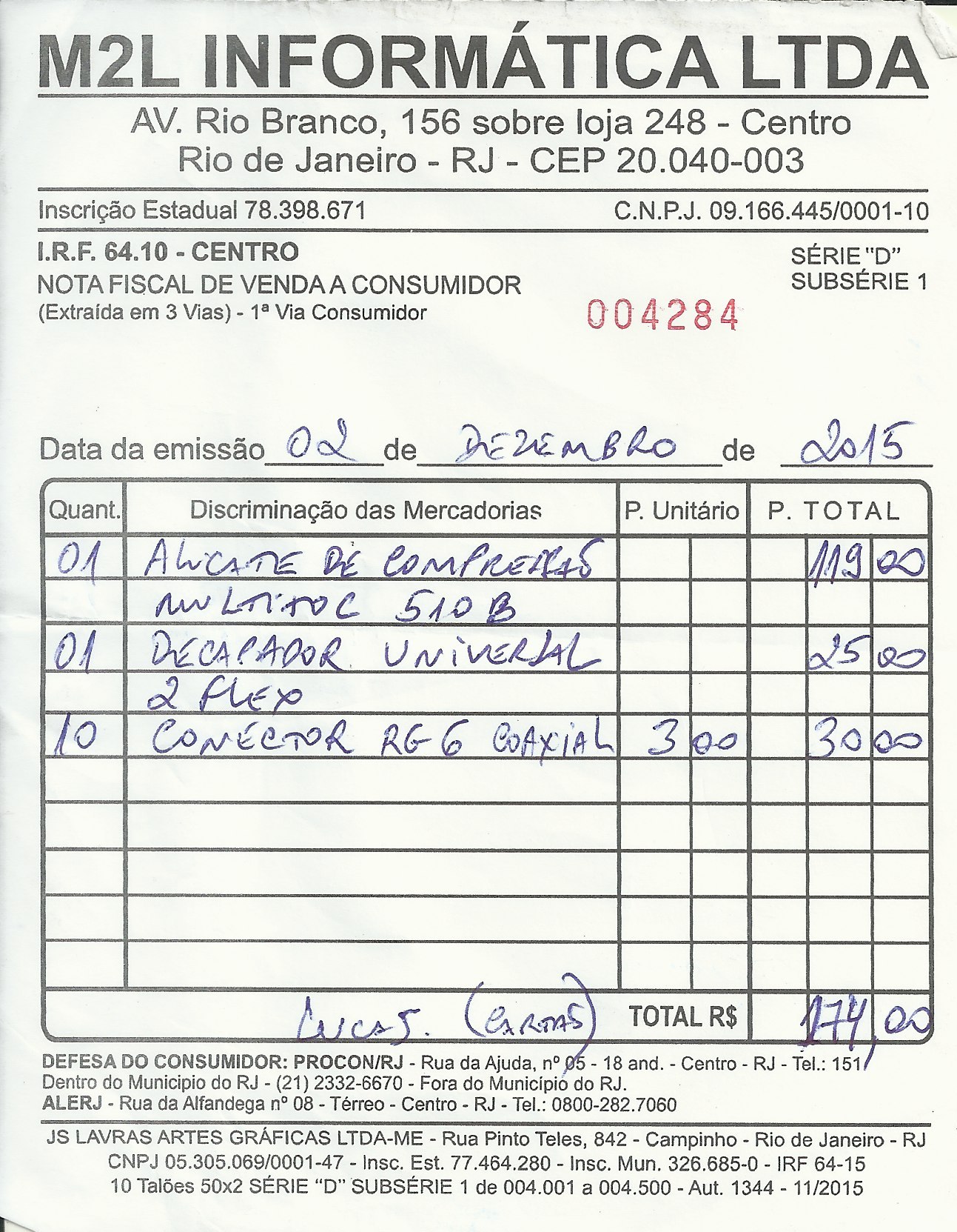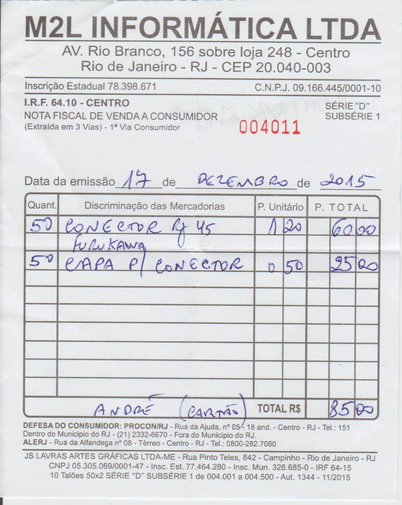 | 17/12/15 | Material crimpar | 1 | 85,00 | 85,00 | 0,00 | 85,00 | Material para crimpar coaxial | M 2 L (Proj Eduardo Figueiredo) |