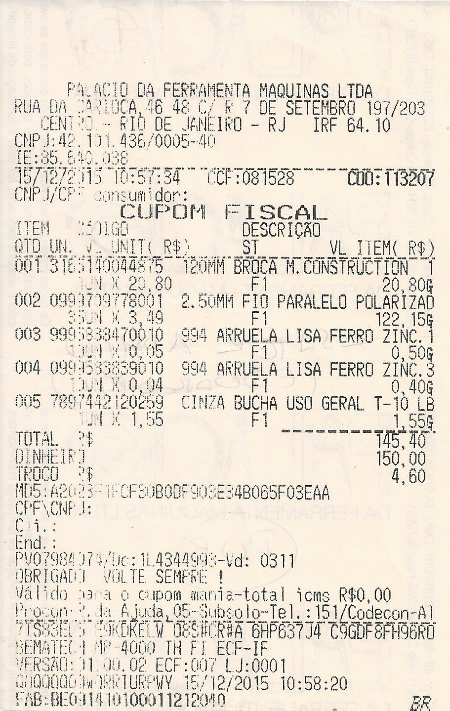 | 15/12/15 | Material projeto | 1 | 145,40 | 145,40 | 0,00 | 145,40 | Material para obra | Palácio da Ferramenta (Proj Eduardo Figueiredo) |