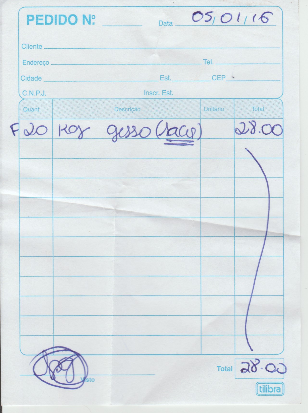 | 05/01/16 | Saco de gesso | 1 | 28,00 | 28,00 | 0,00 | 28,00 | Material obra | Rocinha (Proj Eduardo Figueiredo) |