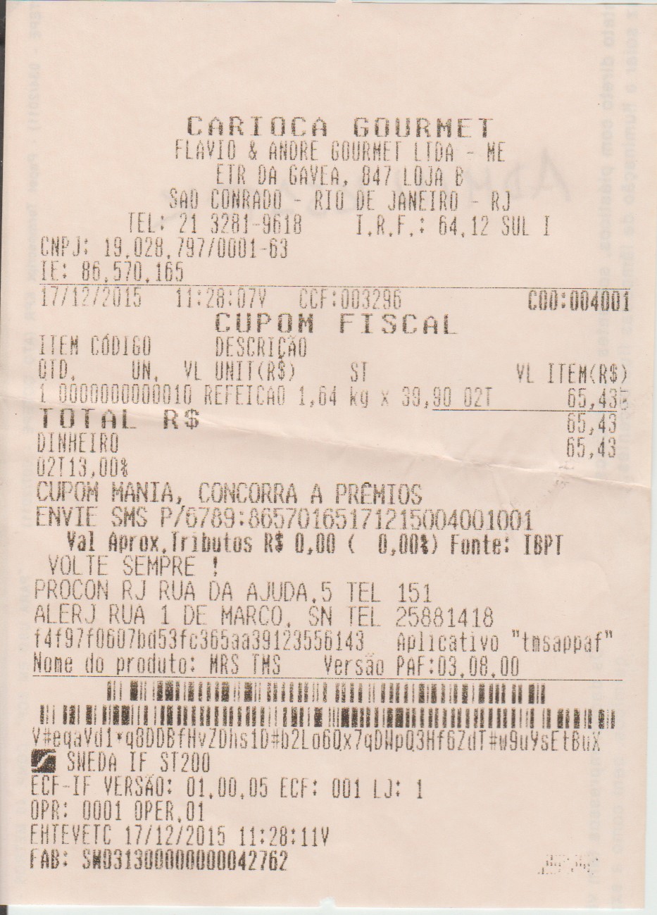 | 17/12/15 | Almoço em projeto | 1 | 65,43 | 65,43 | 0,00 | 65,43 | Almoço equipe | Carioca Gourmet (Proj Eduardo Figueiredo) |